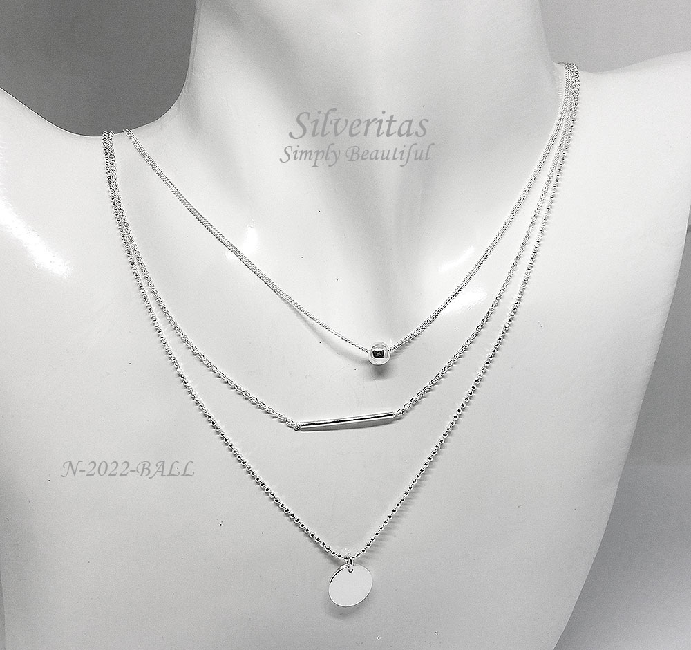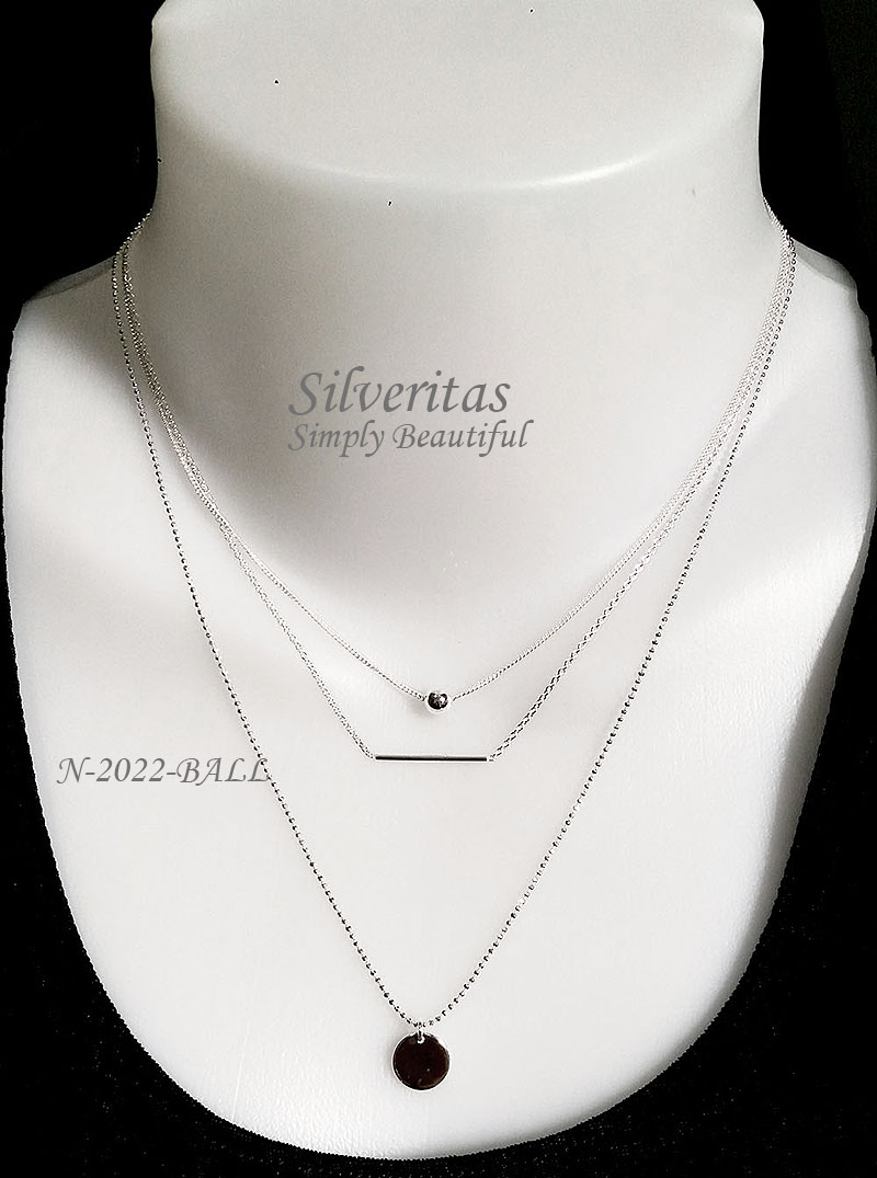 3 strands silver necklace with silver ball + silver bar and silver disc,